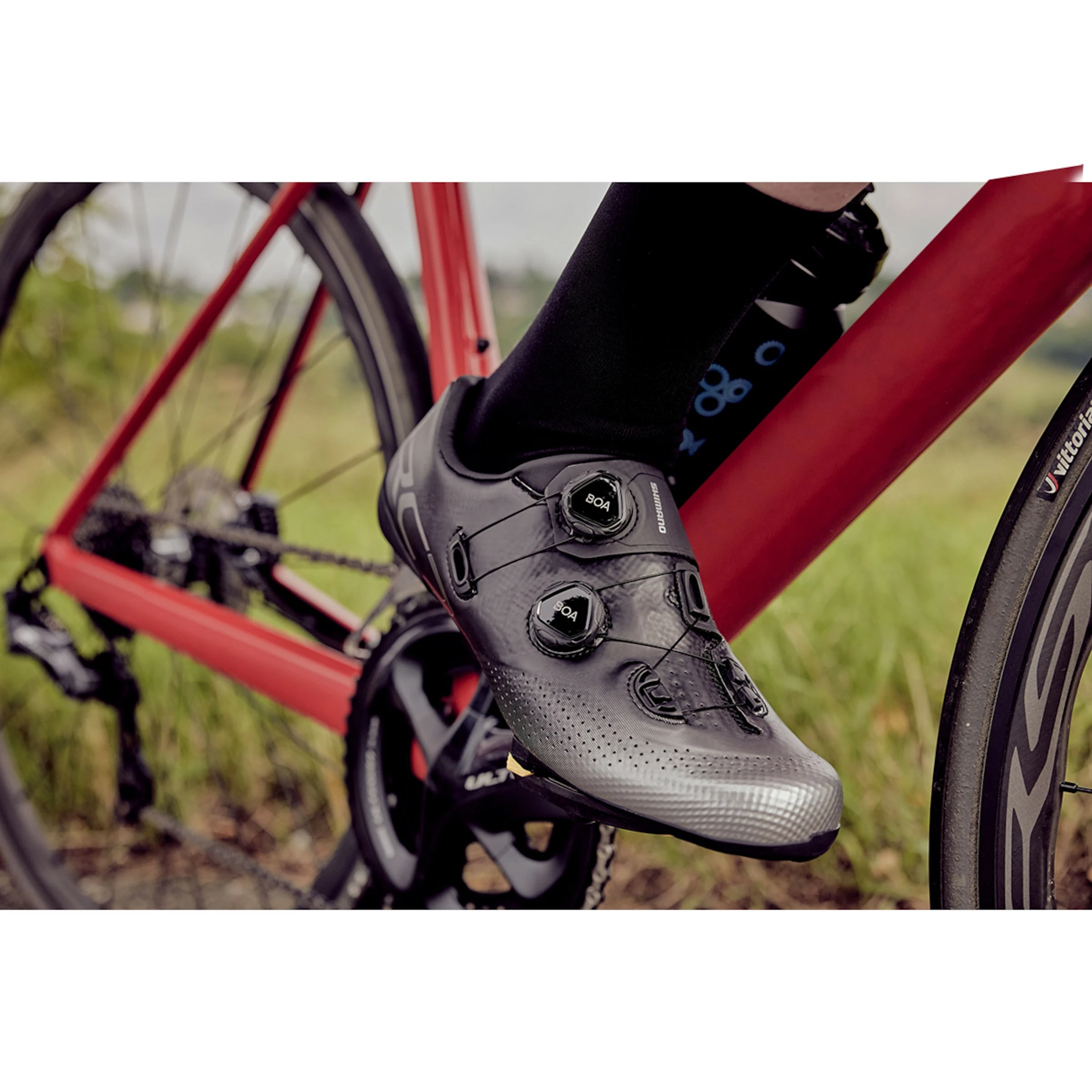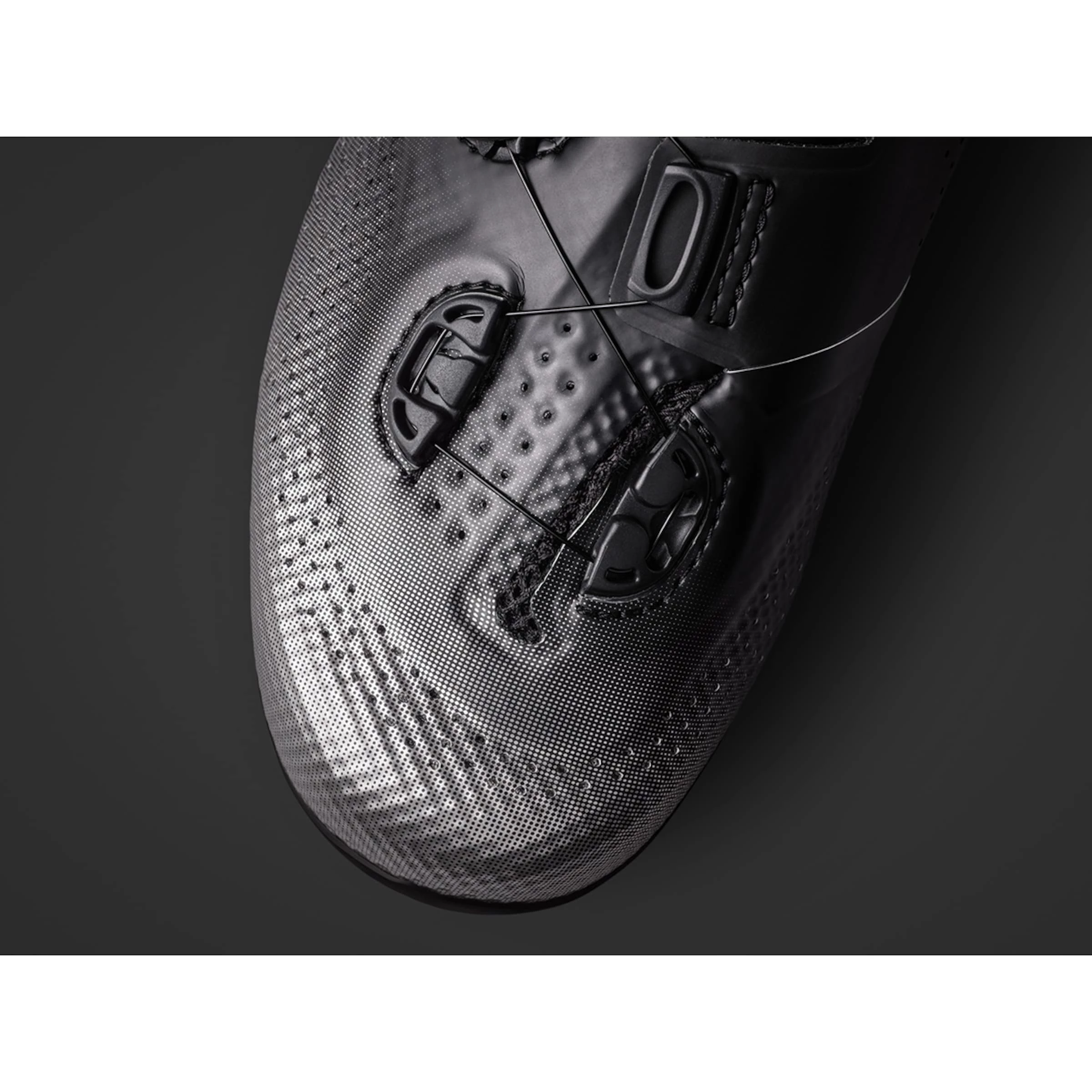 Le système de fermeture est constitué de molettes et de câbles en acier inoxydable qui permettent tous ensemble un ajustage très précis. Il est placé de manière à permettre au cycliste de faire des ajustages en route. Vu l’absence de velcros, l’air peut très bien circuler à l’avant du pied. En appuyant sur la molette et en la tournant dans le sens de la marche, vous fermez la chaussure. En tirant la molette, vous pouvez desserrer les lacets.